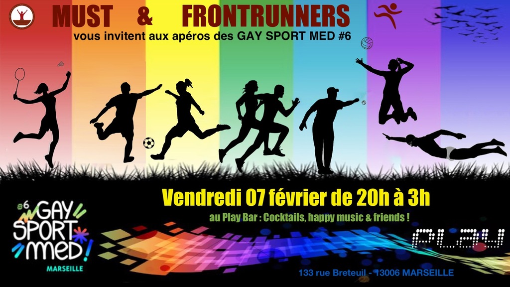 Après l'apéro fabuleux de janvier au 3G, les associations sportives FrontRunners Marseille et MUST, continuent leur circuit, et vous invitent au 2ème apéro de GaySportMed en partenariat avec le Play bar.