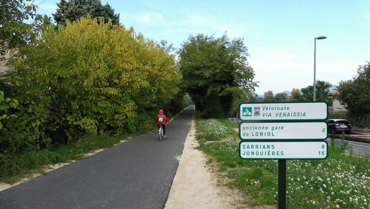 Une balade à vélo sur la Via Venaissia, une ancienne voie ferrée regoudronnée et interdite aux autos. Ce tronçon d'environ 20 km relie Carpentras à Orange. La route est plate.